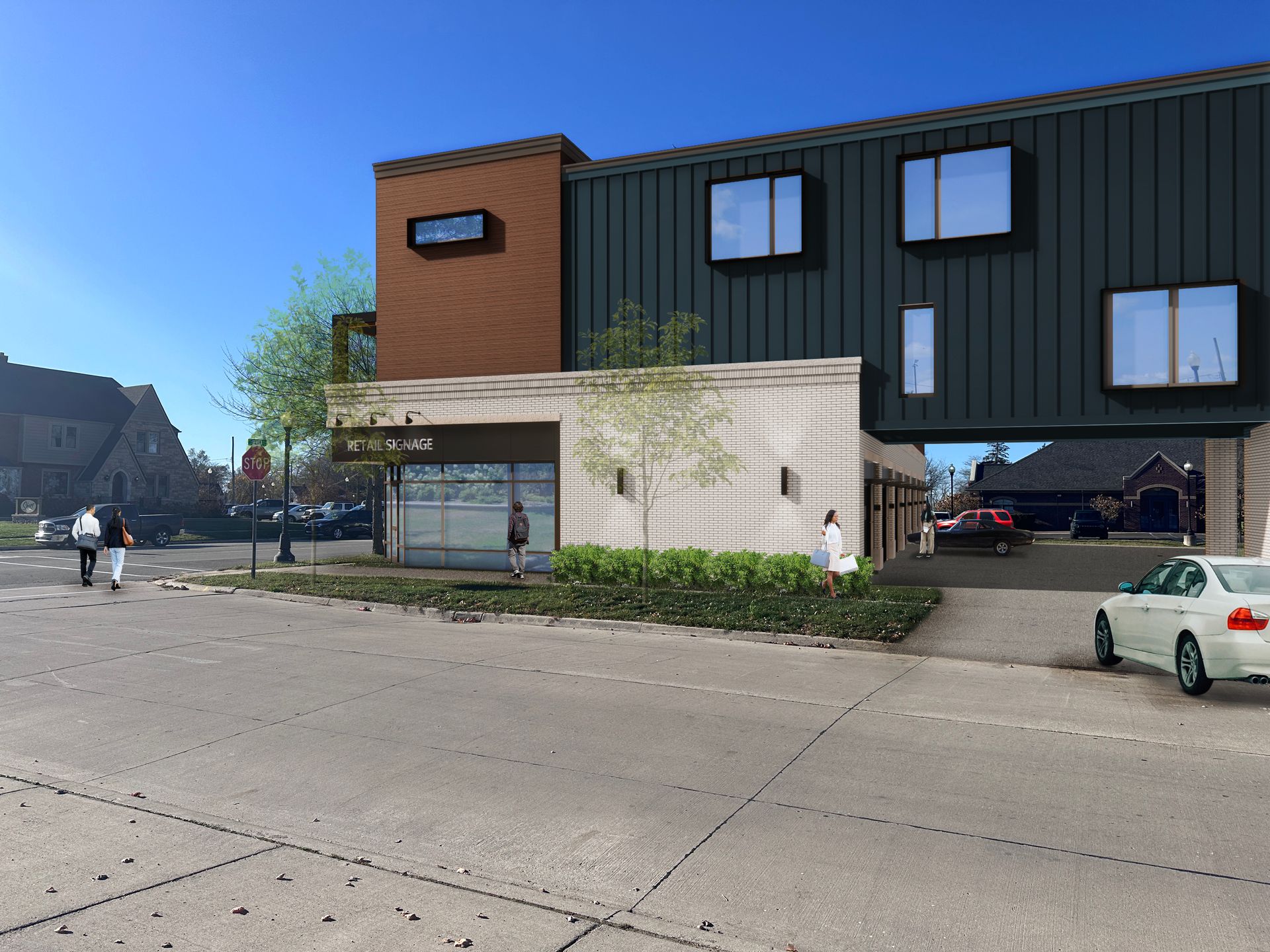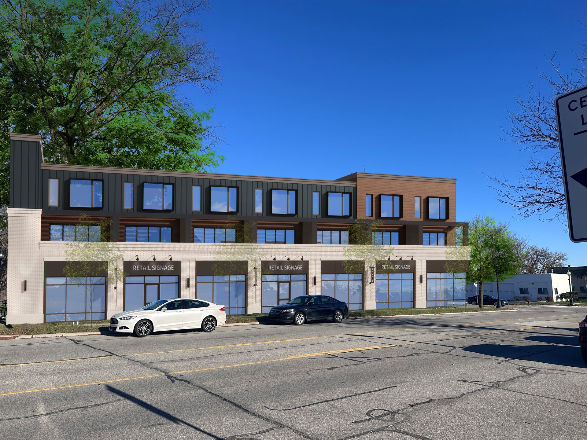 A new 3-story building with ground floor retail and residential on the second and third floors.